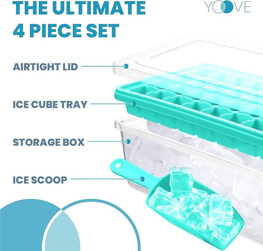 Yoove - Ice Cube Tray With Lid & Bin BPA Free Silicone Container, Nugget Tray With Ladle - Aqua Turquoise