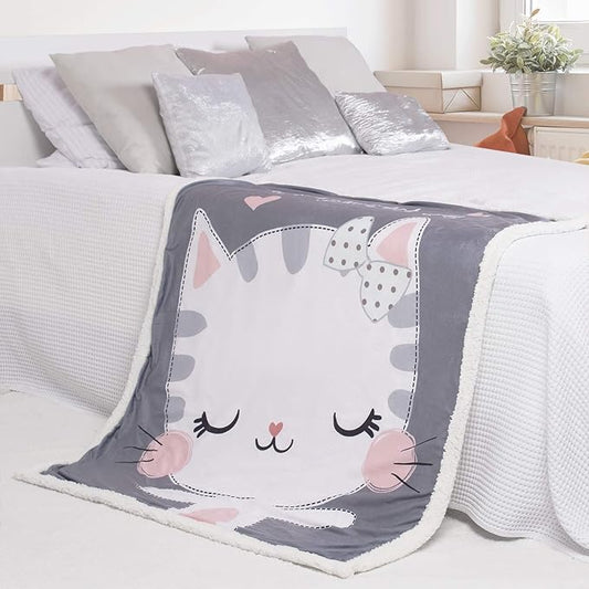 Kitty Fleece Sherpa Blanket Nursery Throw– Grey with Cat Print, 101x127cm