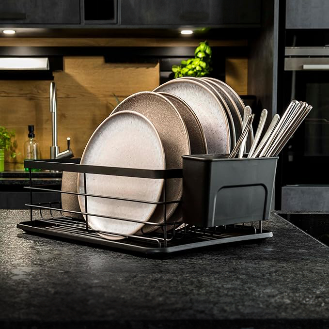 LINFELDT® - Metal Dish Drainer Rack Black - Holds 10 Plates & 20+ Cutlery | Dish Drying Rack for Sink with Cutlery Holder