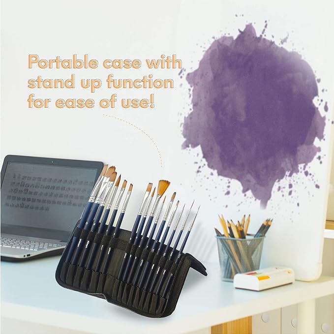 15 PAINT BRUSHES IN PORTABLE CASE - MozArt Supplies’ Paint Brush Set is comprised of 15 paint brushes, with soft and durable brush tips to help you create fine and smooth strokes - Excellent at holding their shape and have fantastic water retention - The set comes in an elegant zippered case with a stand-up function to allow for easy, portable travel use at all times - It’s the perfect all-inclusive paint brush gift set for all artists.