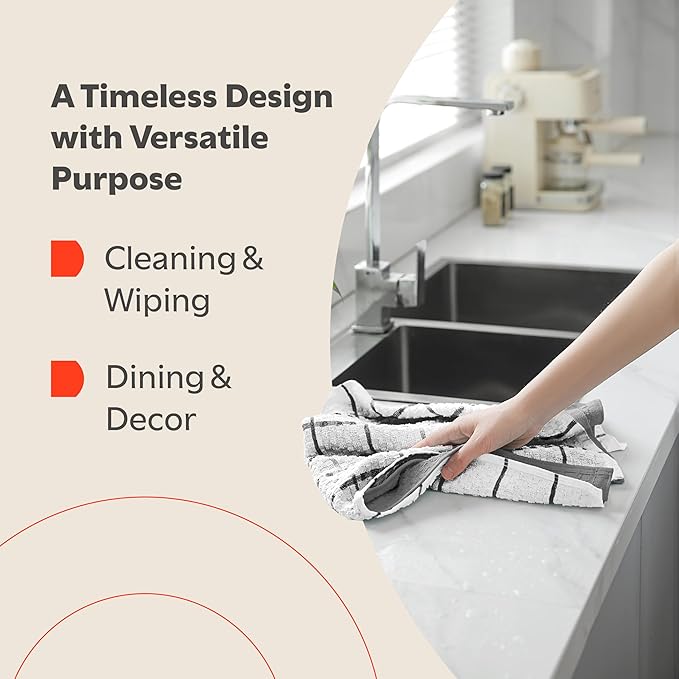 - VALUE PACK: This 12-Pack provides six solid gray towels and six white and black windowpane style towels, so you'll always have plenty on hand; Well constructed, strong dobby weave towel are low lint and reinforced hems prevent unraveling